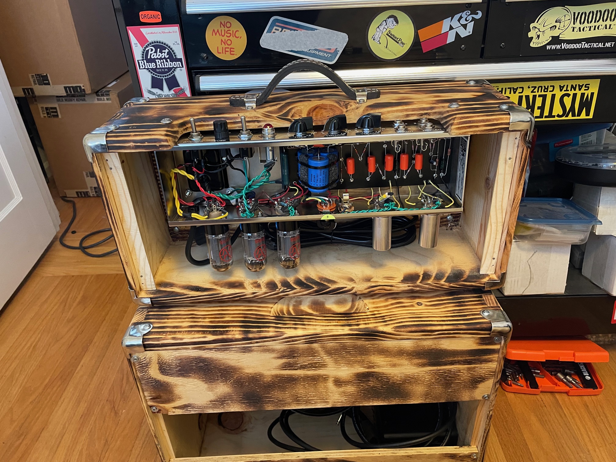 This is a very cool little $55 speaker. It adds very little weight to the head cab. It's mounted on the preamp side to clear the transformers. The custom lacquered tweed cab with baffle was made by John Mergili of www.mergili.com and cost only $259 delivered. Wish your tweed amp had reverb and tremolo like the blackface amps? This is a great way to add it, with my favorite pedal of all time, the Strymon Flint. It does everything from adding a little warmth and thickness to full up 60's surf. The "Color" control is a very usable tone knob. The '61 harmonic tremolo setting is a really nice bonus that sounds very much like the very complicated harmonic tremolo circuit. Try this surf setting and you'll have a blast: Surf City