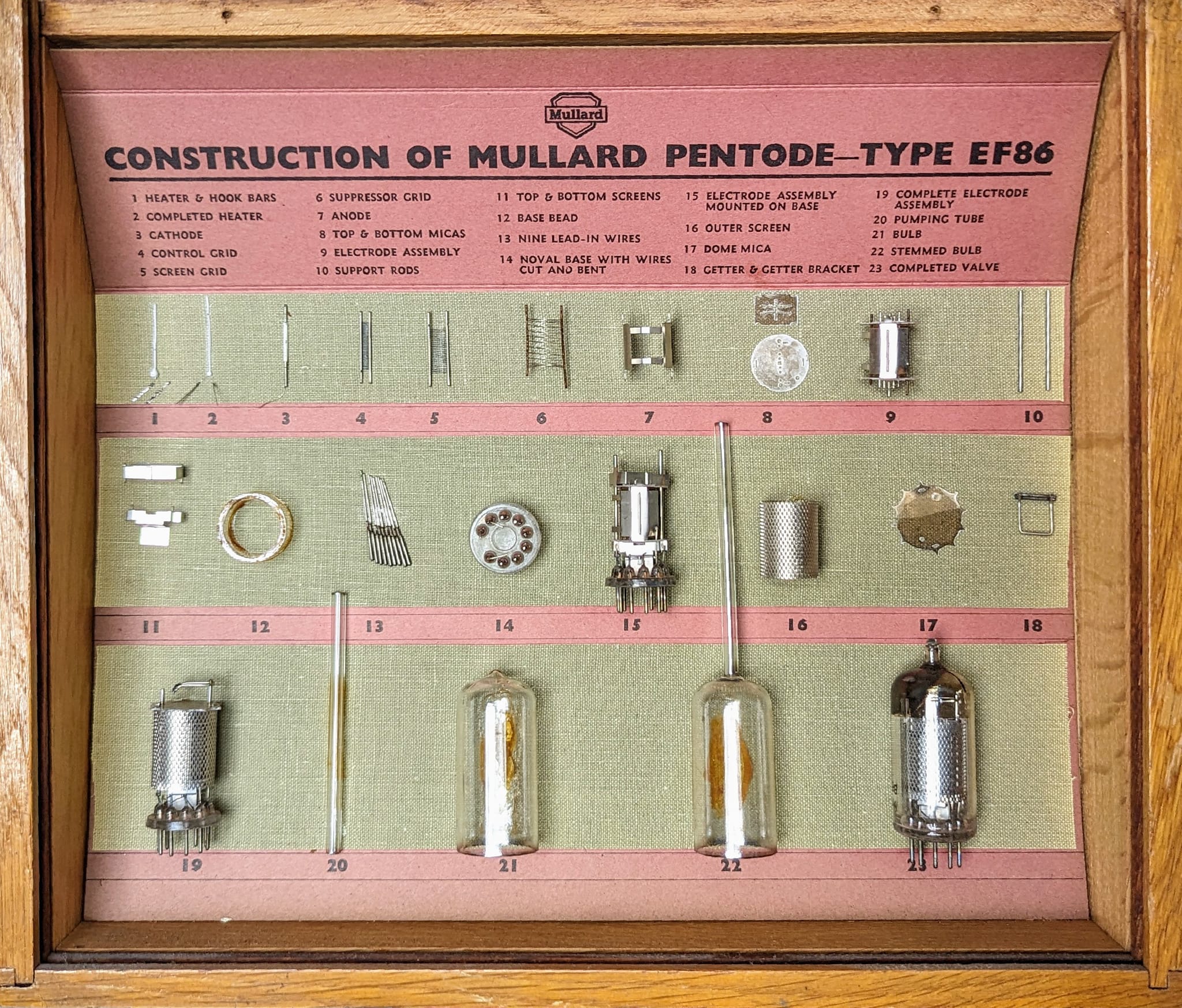 Single triode vacuum tube on the left, note its tubular structure. The 12AX7 middle and right is a dual triode tube--two tubes in one. Pin 1 connects to the Plate (output), Pin 2 the Grid (input), Pin 3 the Cathode (source of electrons). Pin 6 connects to the 'B' triode's Plate, Pin 7 the Grid, Pin 8 the Cathode. Pins 4, 5 & 9 connect to the heater filaments. The halo like 'Getter' at the top of the tube held the material used to create the 'Getter Flash' (mirror-like substance on top inside of tube). The Getter Flash absorbs gas molecules to maintain the tube's vacuum. If the Getter Flash turns from silver to ash white you know the tube has been contaminated with too much oxygen from a vacuum leak.