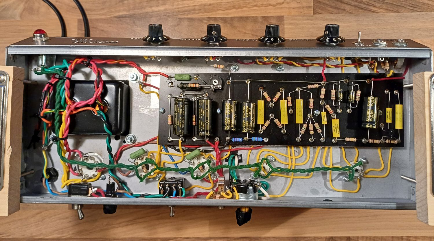 The amp was hand made by Iain, from the turret board to the ash/ebony cab and nitro finish. The chassis is a drilled out 5F2 Princeton chassis (it was a tight squeeze). He used a tweed Bassman power transformer and a 9 Henry choke. The output transformer is a standard Hammond Vibroverb. Circuit TweaksThe AB763 Vibroverb's reverb, tremolo and Vibrato Channel were deleted. The Vibroverb has no Mid tone control on either channel but I added one to the Blackvibe to enhance tone shaping. I used a 100KA pot for the Mid/Raw control versus the AB763 standard 10KA so we can dial out some mid scoop and boost preamp gain. This added gain is enough to surpass the Vibroverb's Vibrato Channel preamp gain. With the Mid/Raw control at full "down" you get the Vibroverb's standard 6.8k of mid resistance so keep the Mid/Raw control full down for true Vibroverb tone but turn the control up and mid frequencies and gain are added. Near the end of the knob turn we're approaching tweed territory. I deleted the separate bias board and moved the components to the main circuit board. I also modified the bias circuit to add a Balance pot and increase the bias range. The Balance pot allows us to set the same bias current in both power tubes even without a matched pair. It also allows us to dial in some intentional mismatch to add sweet sounding even order harmonic distortion to thicken up the clean tone. The bias circuit 50k trim pot can bias 6L6GC tubes hot and yet can still cool the bias for a pair of JJ6V6 too. See Adjustable Balanced Bias for details. If you want to stick with the "normal" AB763 bias circuit just reference the Vibroverb layout at the bottom of this page. The filter cap "doghouse" has been eliminated by moving the filter caps to the main circuit board. The deletion of the reverb and tremolo freed up lots of circuit board real estate. Skip Johnson's BlackvibePhoto and chassis by Skip Johnson. A Fender style dual ground bus is used. The power tube screens, phase inverter and preamp triodes are grounded to the chassis at the input jacks. You must use a star washer on the input jack with the chassis ground to ensure a solid chassis ground connection. The power tubes are grounded to the chassis at the "Power Amp Ground" located near the power transformer. The 6.3v center tap is also grounded there. The transformer high voltage tap should be soldered to the first filter cap pair's negative terminal to minimize hum as shown in the layout above. The bias circuit is grounded to the Bias Balance pot so use a star washer on the pot for a solid ground connection. Although the Blackvibe is a single channel amp I kept the AB763 220k channel mixing resistor because it has an effect on the phase inverter's overdrive tone and preamp gain. When testing the Blackvibe I realized it had quite a bit more preamp gain than my blackface Band-Master and blackfaced Bandmaster Reberb normal channels. I soon realized I had underestimated the load presented to the normal channel by the vibrato channel. I added a 270k "Vibrato Channel Load" resistor to take the place of the Vibrato Channel's 220k mixing resistor and 50k Tremolo Intensity pot to ground (the Tremolo pot is also in parallel with a 100K plate load resistor to "AC ground"). The Blackvibe's 220k Mixing and 270k Vibrato Channel Load resistors form a voltage divider which attenuates the guitar signal by 45% just like in the two channel AB763. I did this to recreate the most authentic AB763 blackface normal channel tone but you can delete the 220k mixing resistor and 270k Vibrato Channel Load resistors to add preamp gain if you prefer. Placing the Vibrato Channel Load resistor on a switch will provide a nice "Preamp Boost" when the resistor is disconnected. We can also raise the value of the Vibrato Channel Load resistor to increase preamp gain. A 1M load resistor will only attenuate guitar signal by 18% compared to the 270k at 45%. I added rectifier "backup diodes" to protect the amp from a rectifier tube short failure. The diodes also make life easier on the rectifier tube so it should last longer. I increased the watt rating for many resistors to promote longevity and reduce speaker hiss. The layout also shows the use of metal film resistors on the input jacks in an effort to reduce hiss. If you plan to use the amp in the studio consider using all metal film resistors to minimize hiss. The build can be simplified by eliminating the Bright Switch, Bright Cap and Standby Switch, none of which are really needed.